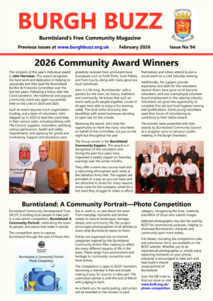 The Burgh Buzz is a free community magazine produced every three months and distributed to all households in Burntisland, the picturesque seaside town with a population of around 6,600 which lies on the south coast of Fife, Scotland. First published in 1998, each edition features local issues, news and updates from community organisations, local history, people, upcoming events, and more.